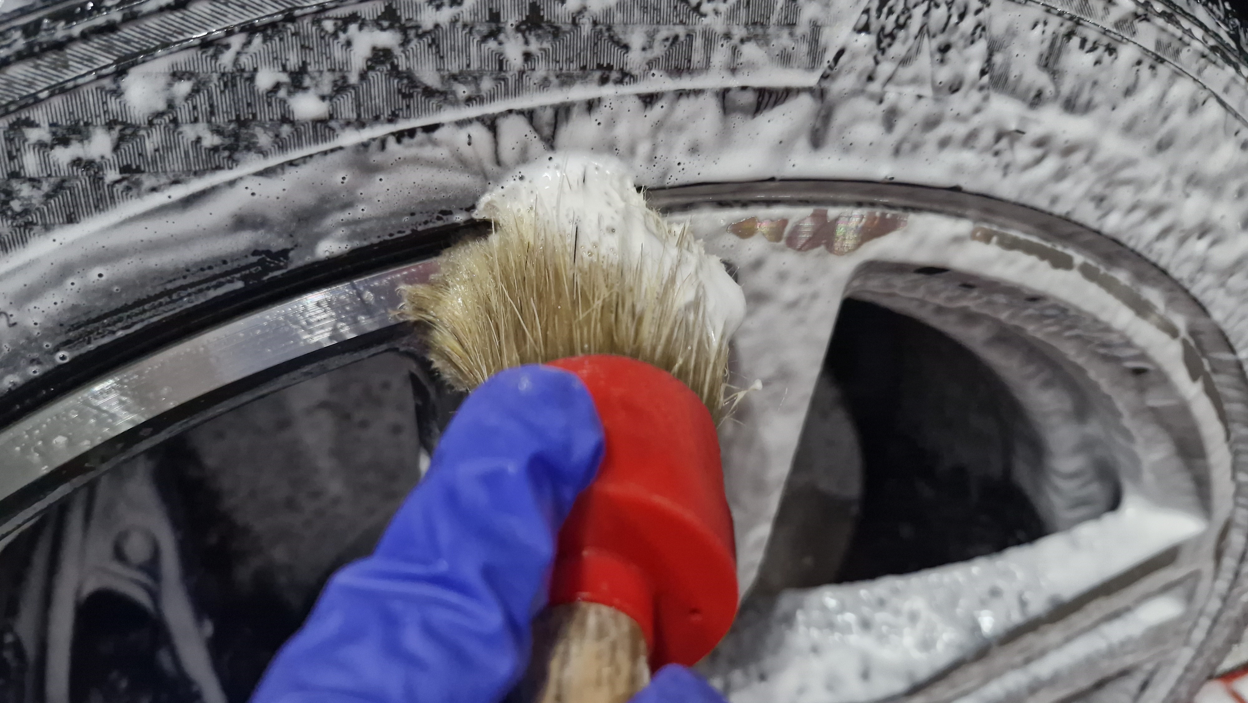 휠에 휠 샴푸를 충분히 뿌려주고~ 브러쉬로 문질러 줍니다.