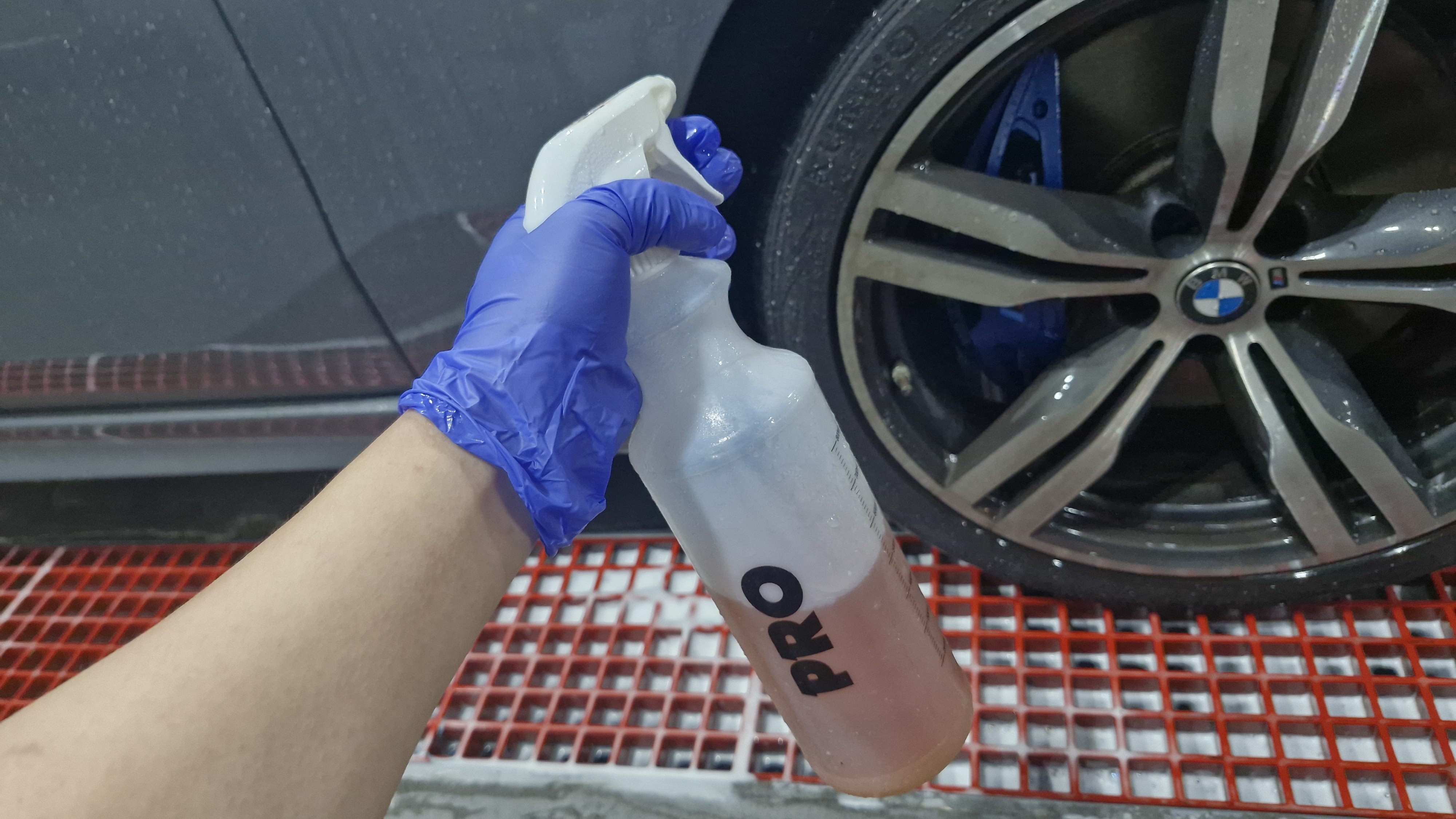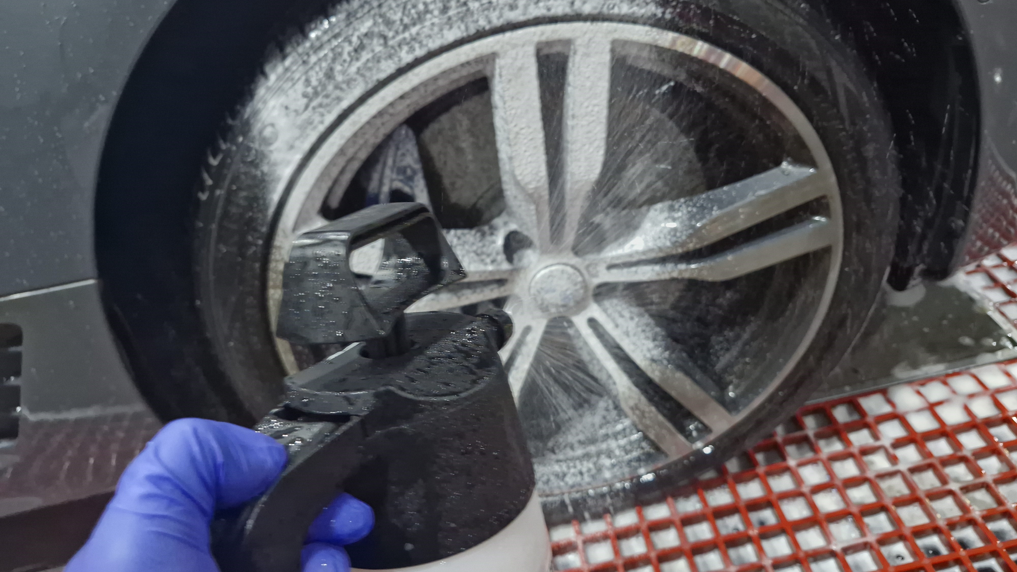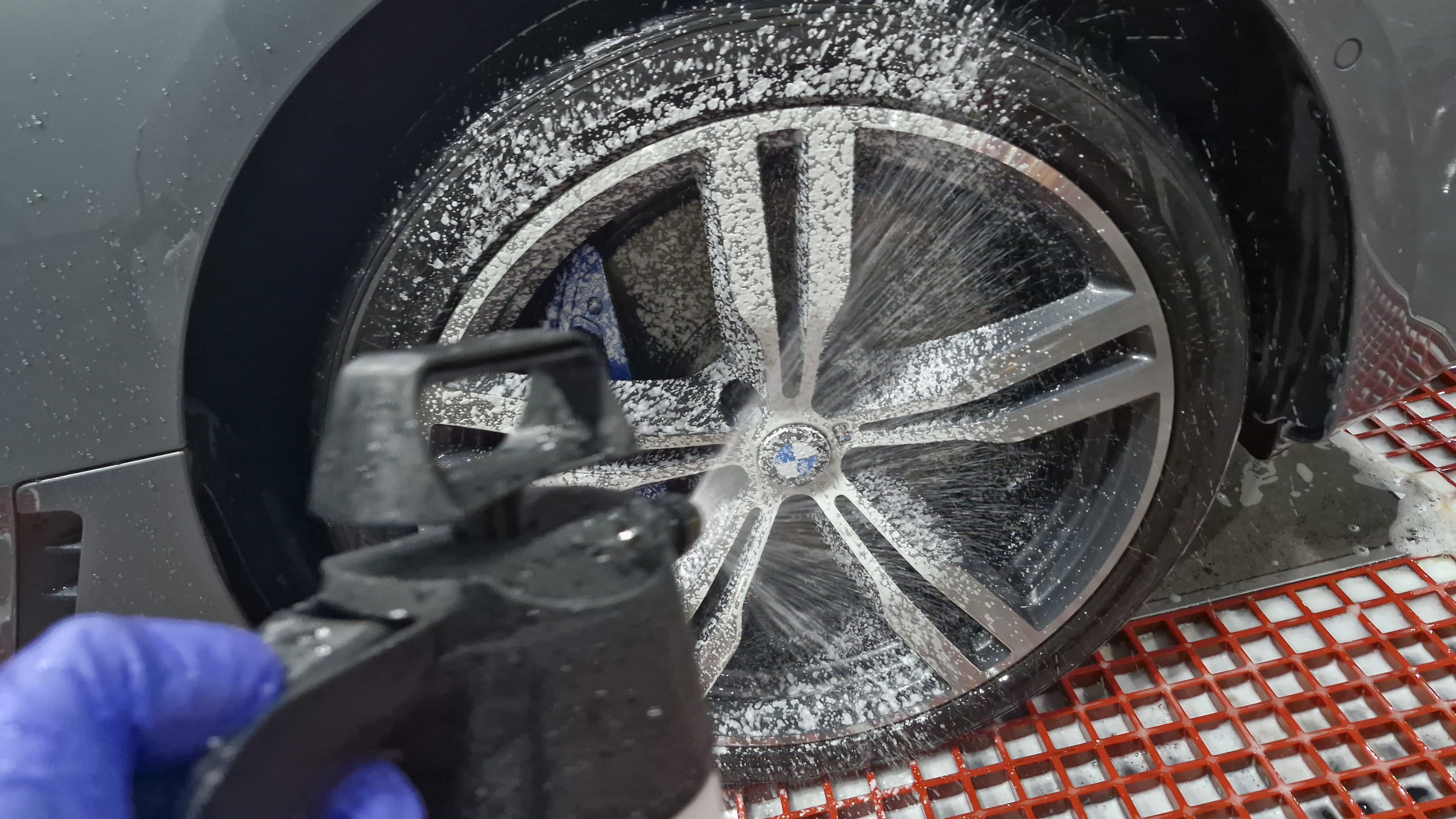 도장면과 휠에 프리워시를 뿌려주고~ 고압수로 1차 분진을 제거해 줬습니다.