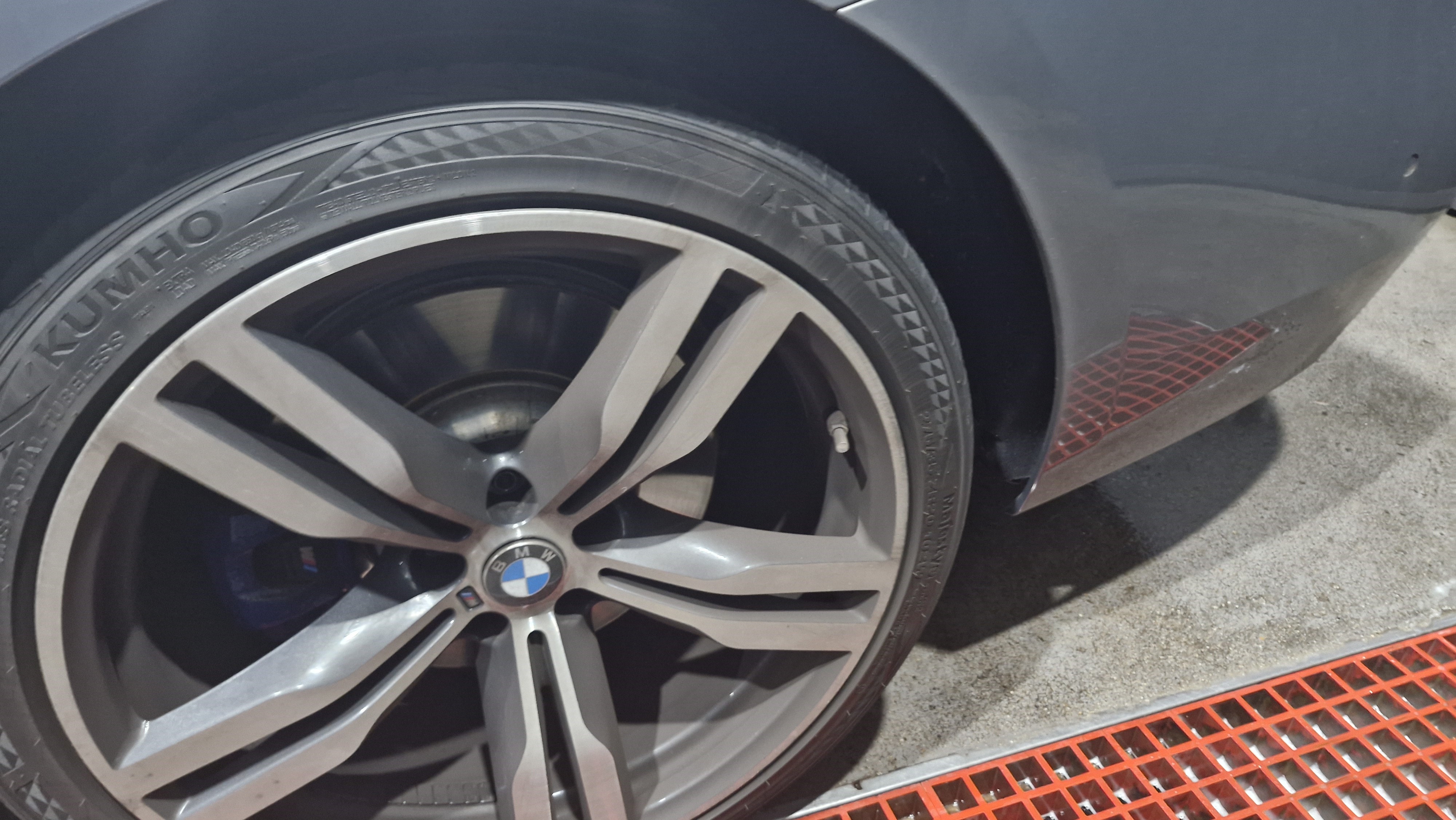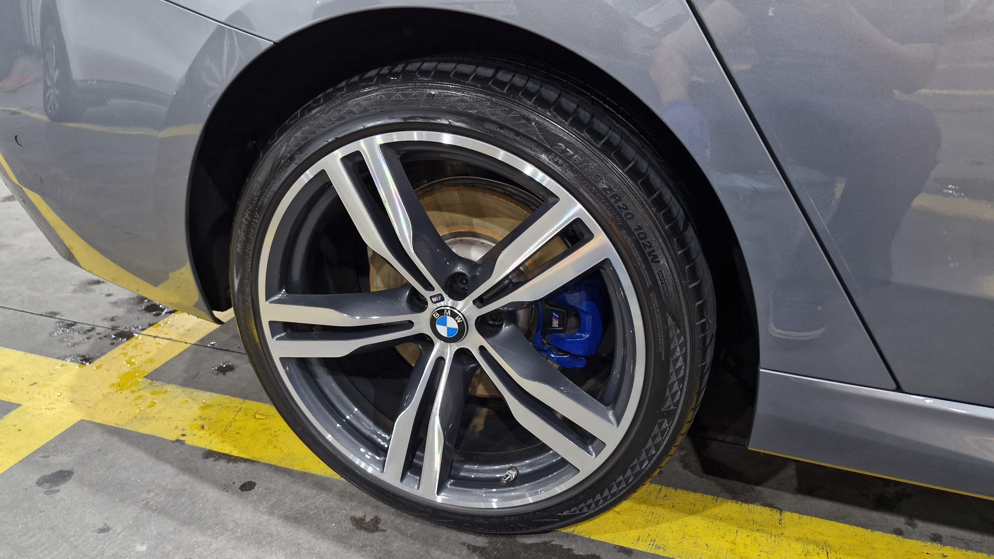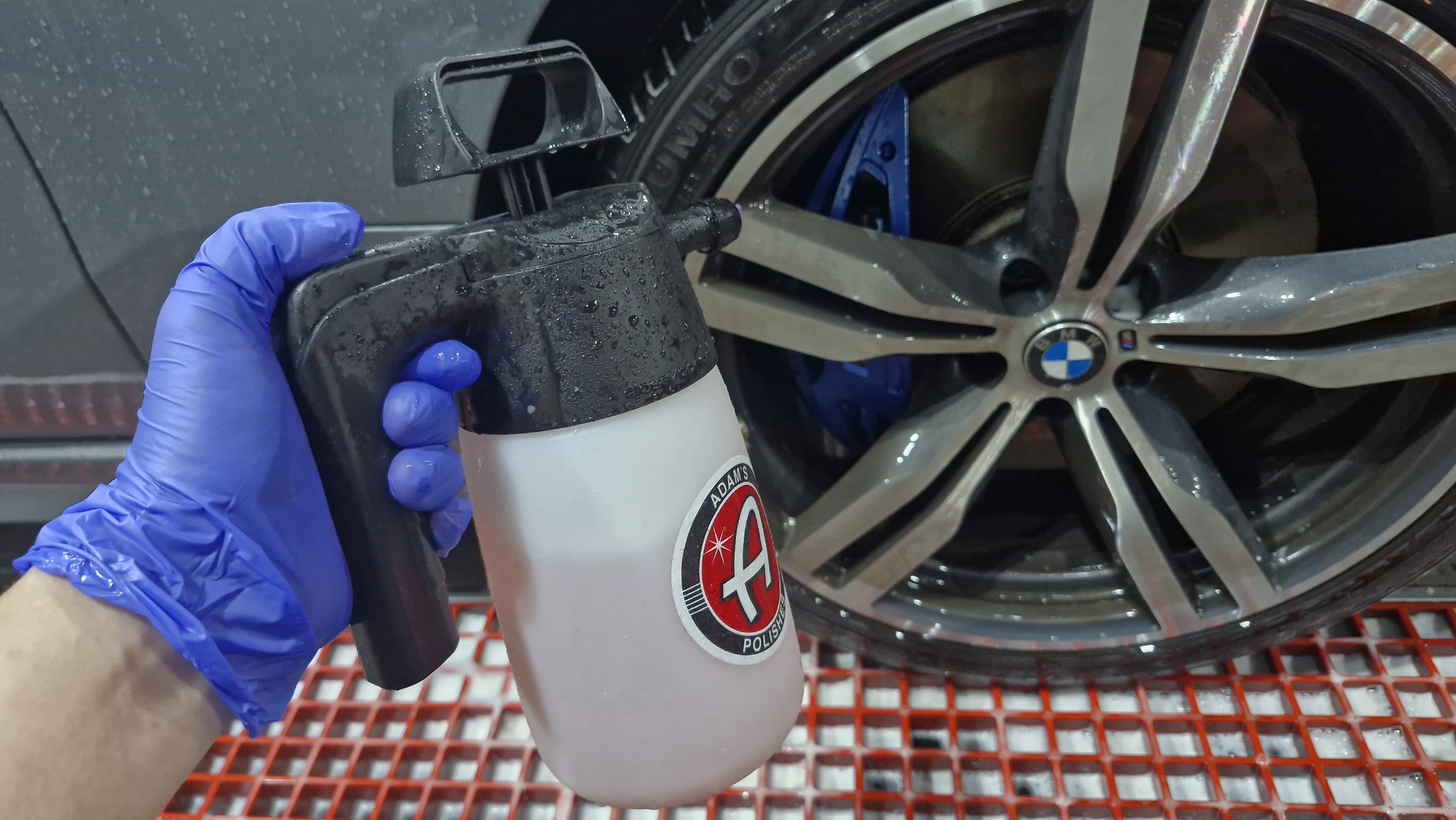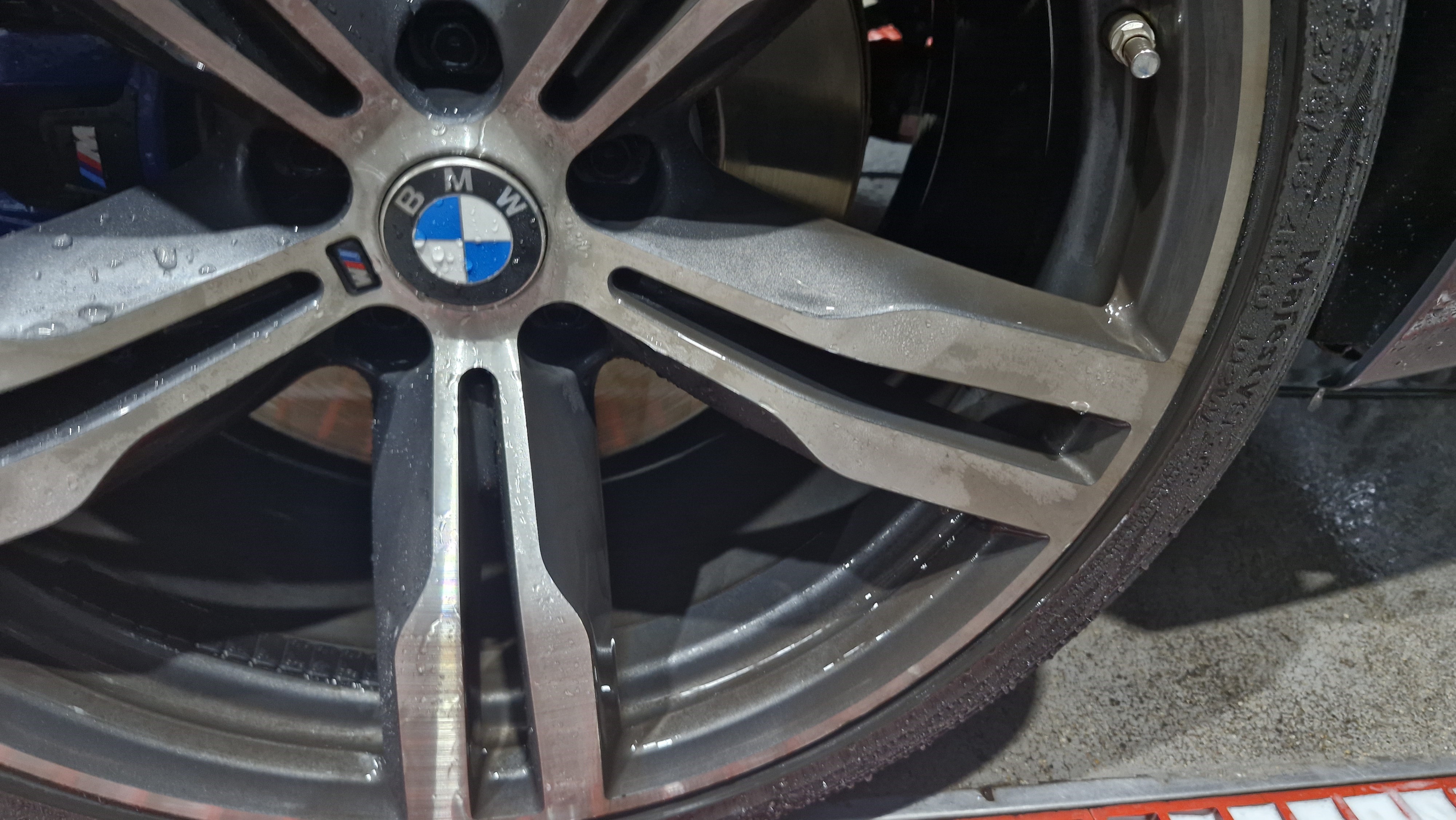도장면과 휠에 프리워시를 뿌려주고~ 고압수로 1차 분진을 제거해 줬습니다.