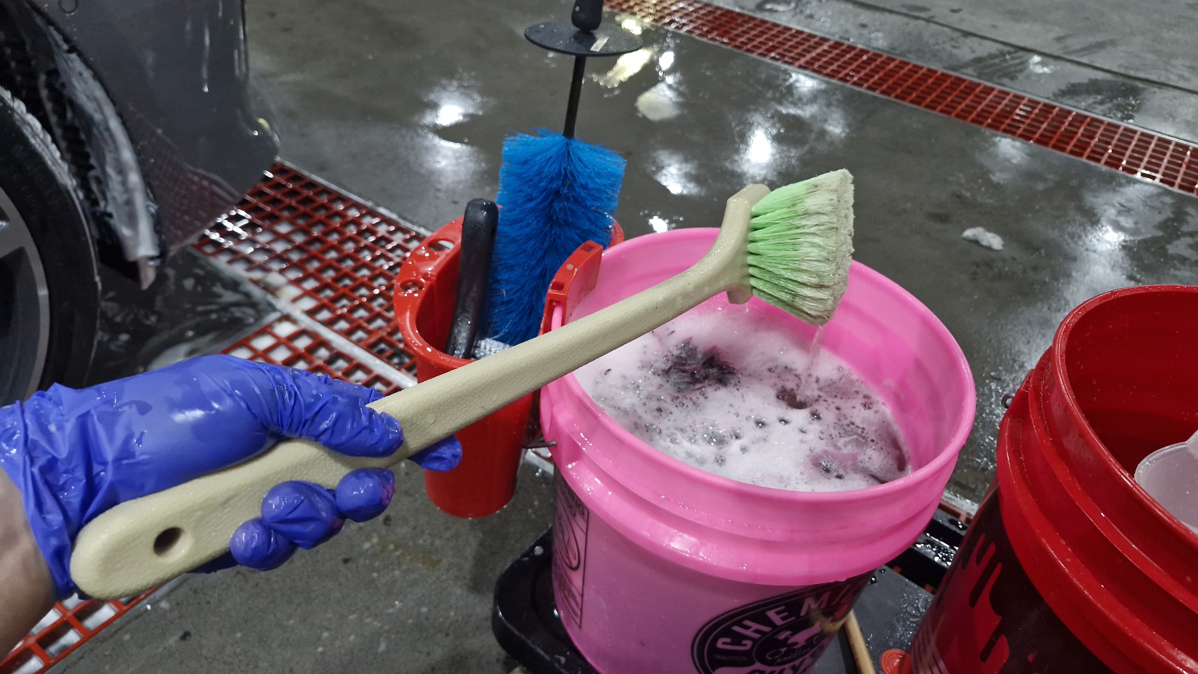 훕스 휠 샴푸를 푼 버킷 거품을 떠서 브러쉬로 문질러줍니다.