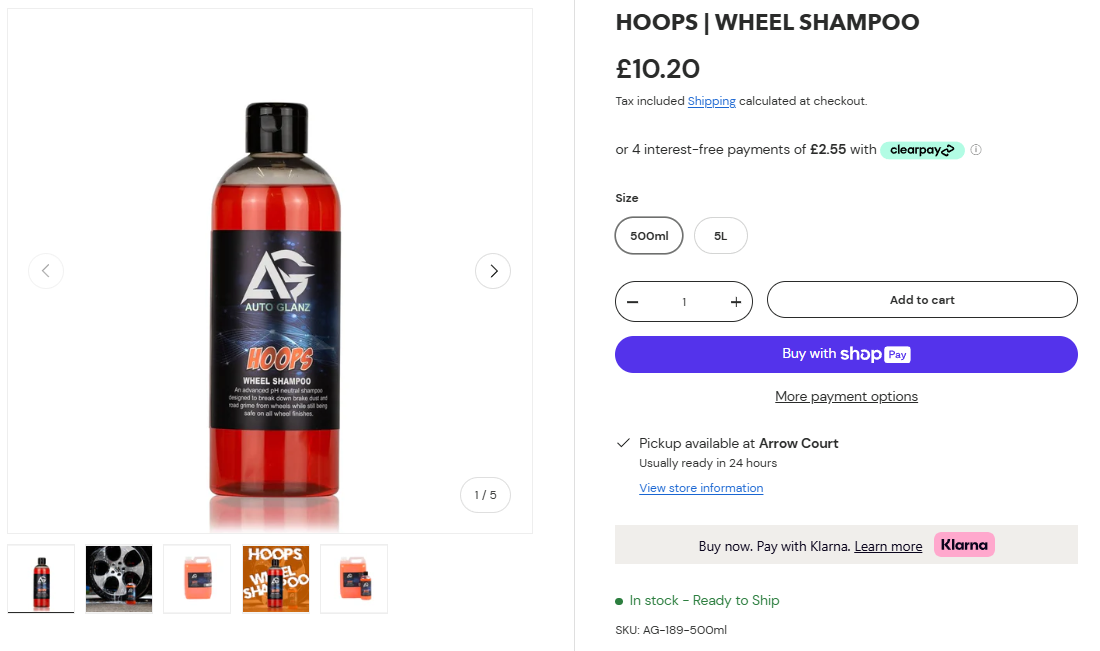 영국 오토글란츠의 공홈에서는 훕스 휠 샴푸가 500ml 용량에 £10.20(2025. 6. 3. 기준 환율 19,000원 상당), 5L 용량은 £31.72(59,000원 상당)에 판매를 하고 있습니다.